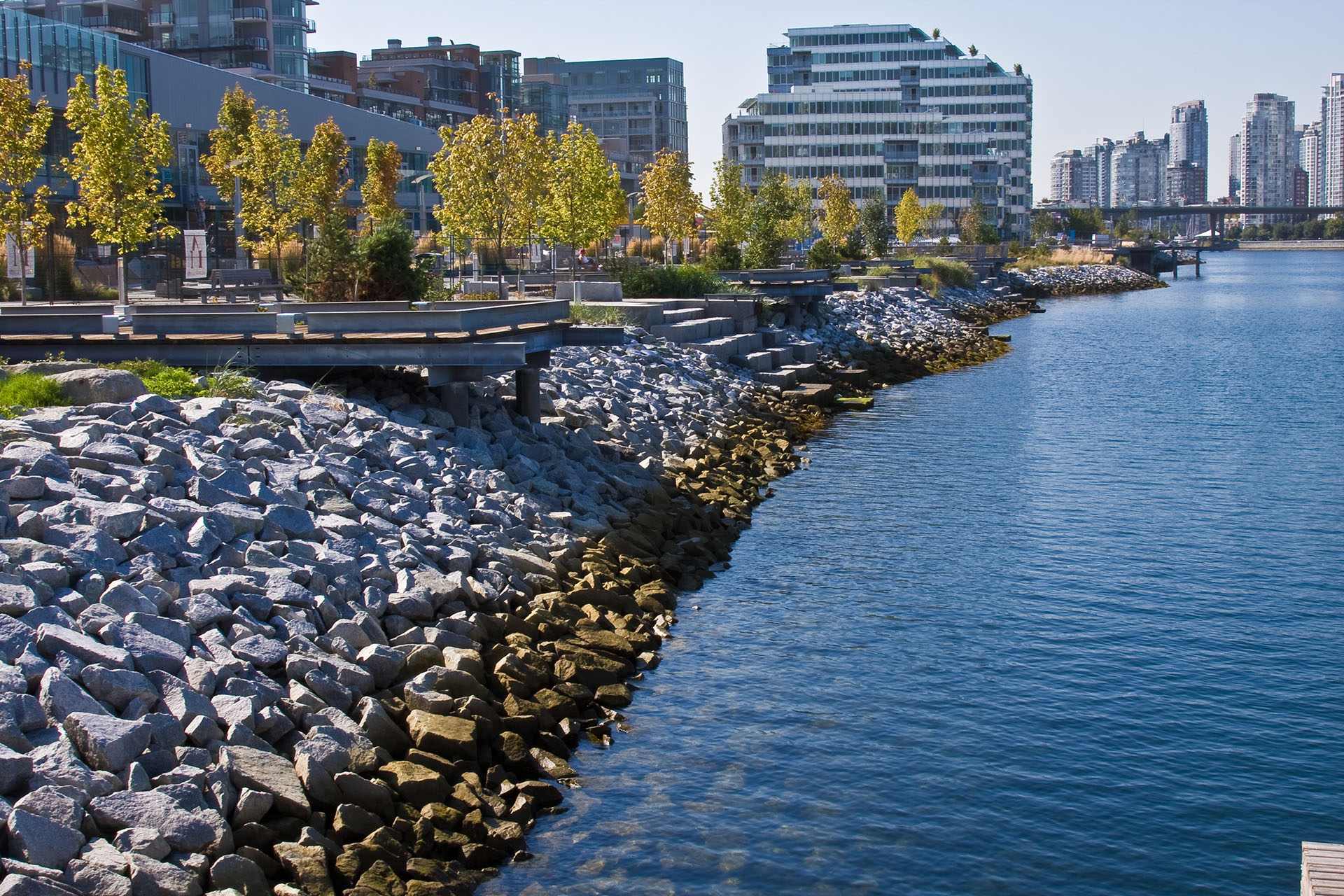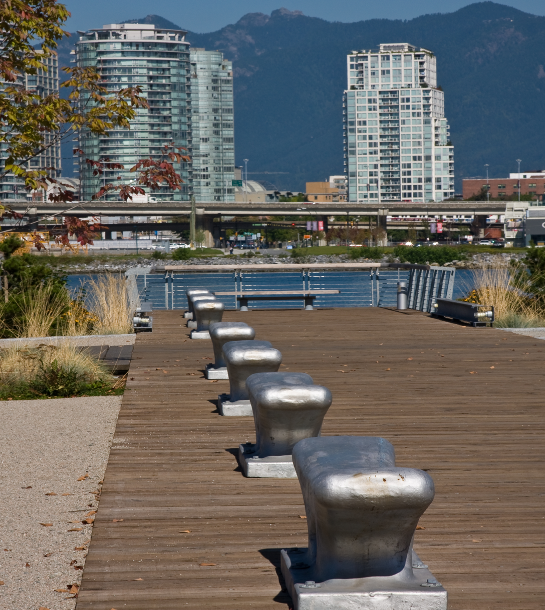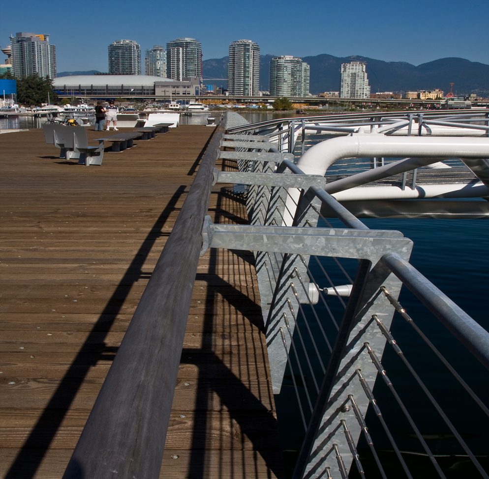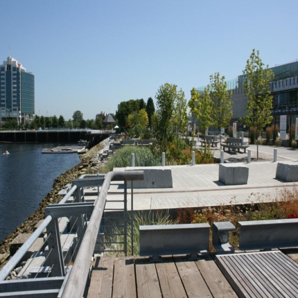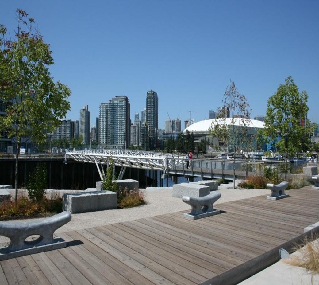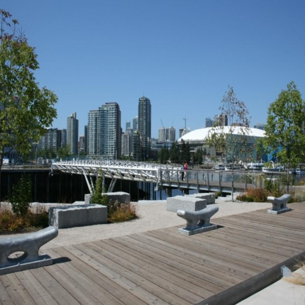 The Waterfront Park project in South East False Creek is the latest major addition to the extended Seawall walkway. A highly developed open space with a wide range of landscape features including a 40 meter steel pedestrian bridge and a structural soil system allowing trees to grow with out being hindered by compacted soils. This is an award winning project for quality of design and construction.