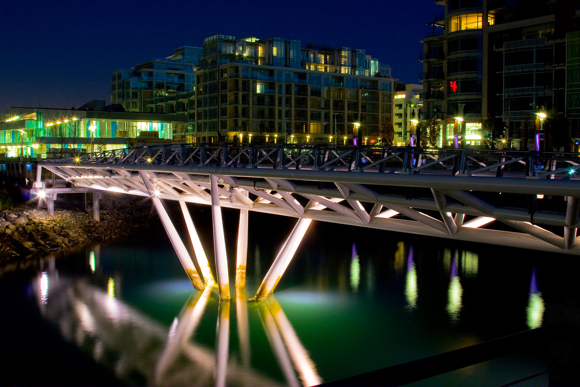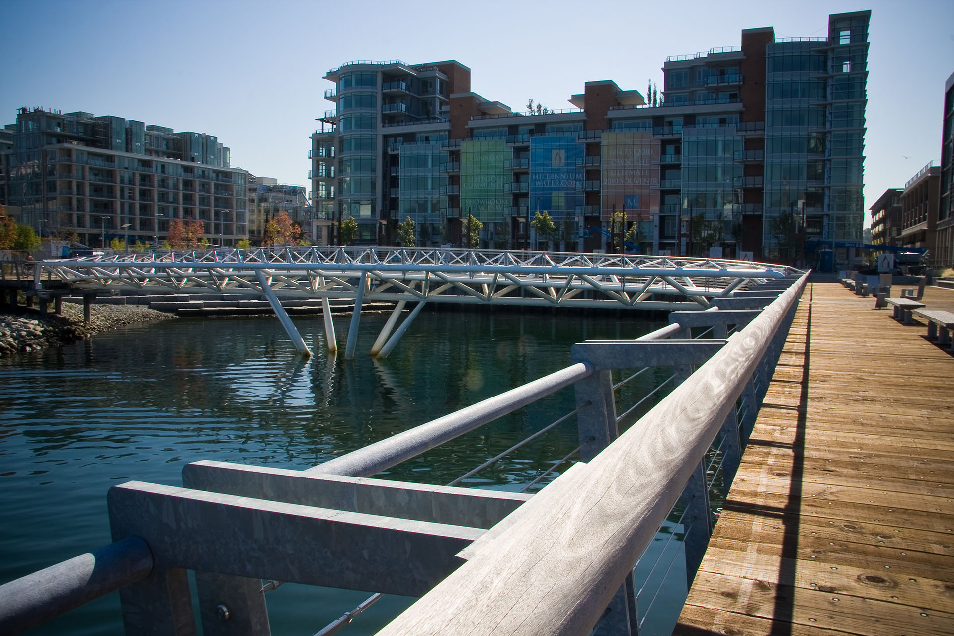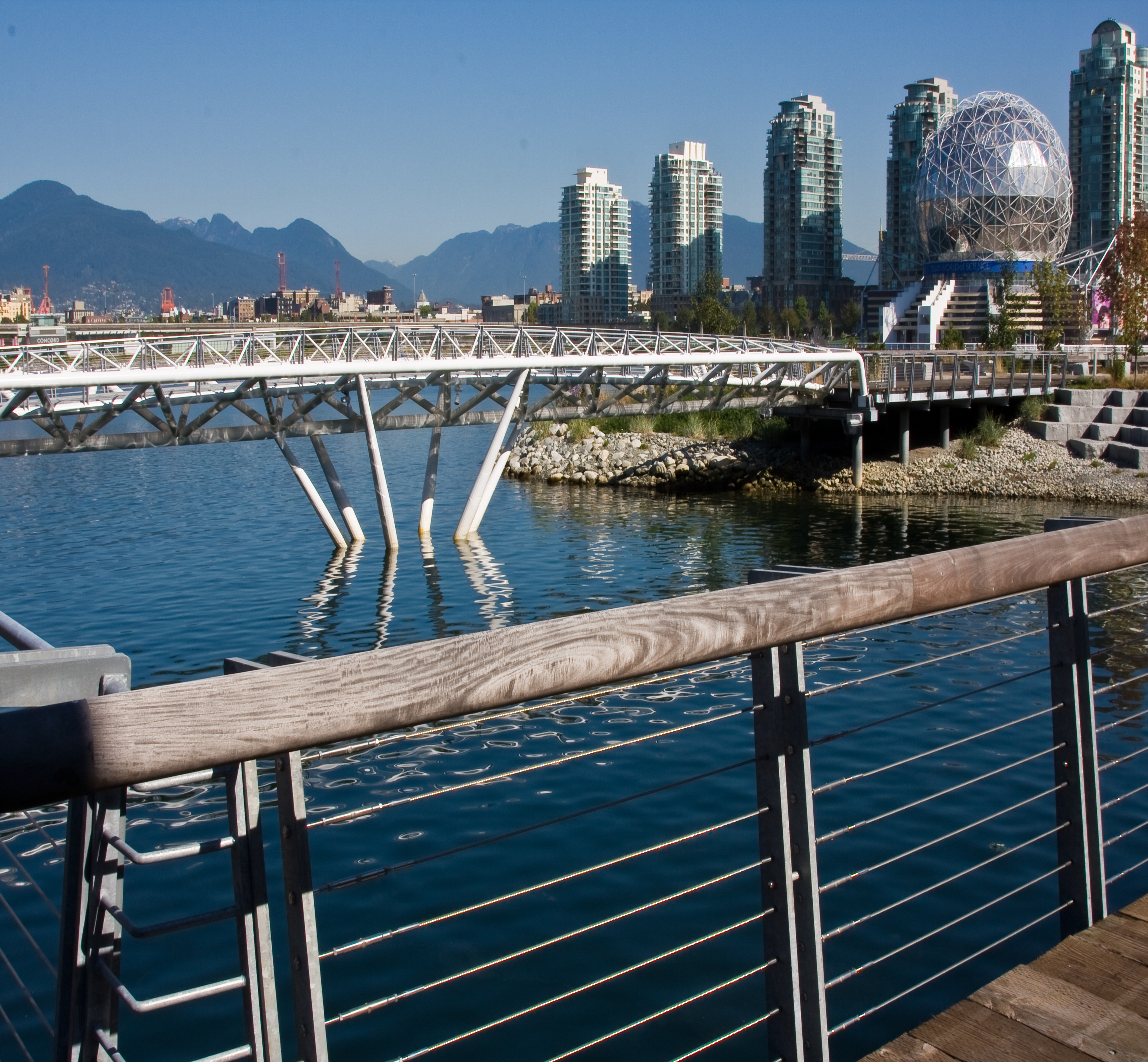 The Waterfront Park project in South East False Creek is the latest major addition to the extended Seawall walkway. A highly developed open space with a wide range of landscape features including a 40 meter steel pedestrian bridge and a structural soil system allowing trees to grow with out being hindered by compacted soils. This is an award winning project for quality of design and construction.